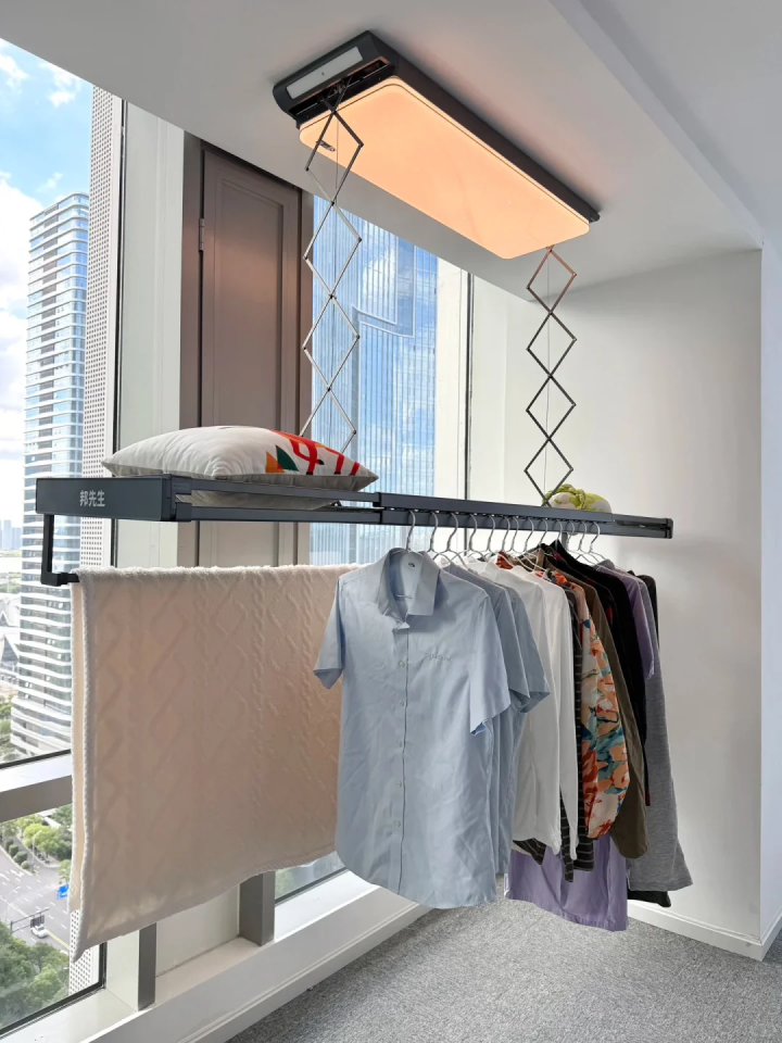 普通的晾衣架虽然款式多样,但各有各的弊端,因此,为了撑面子,为了美观实用,我毫不犹豫的选择了智能晾衣架。