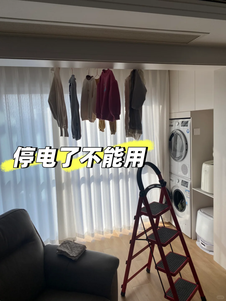 如,说是可以自动升降,但没电了就不能用了,而且往上挂衣服的时候需要做好平衡,不然整个晾衣架就会歪歪斜斜。